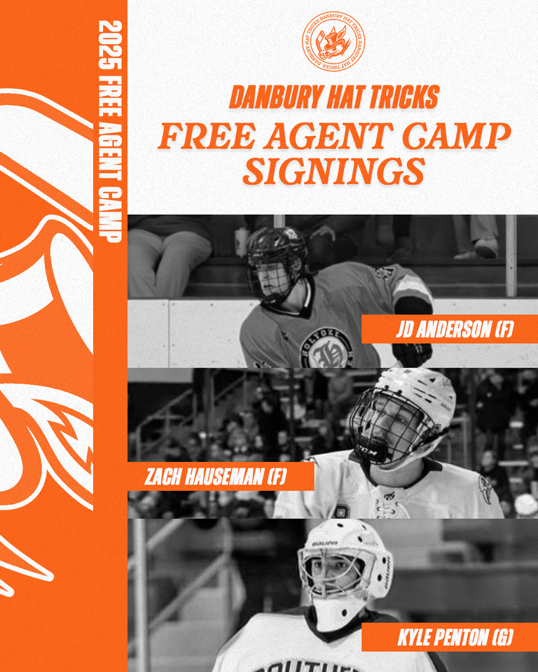 DANBURY — The Danbury Hat Tricks have signed three players from their 2025 Free Agent Camp: forward JD Anderson, forward Zach Hauseman, and goaltender Kyle Penton.
