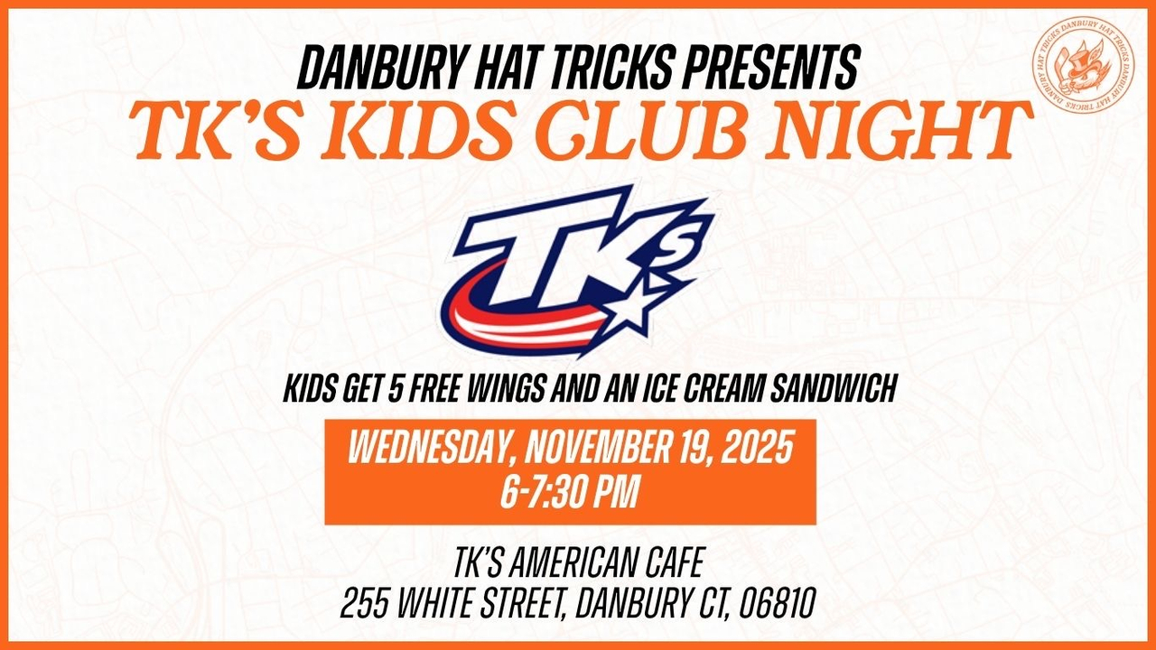 DANBURY — The Danbury Hat Tricks are hosting an exclusive Kids Club Night on Wednesday, Nov. 19, from 6–7:30 PM at TK’s American Cafe on 255 White Street, Danbury, CT.