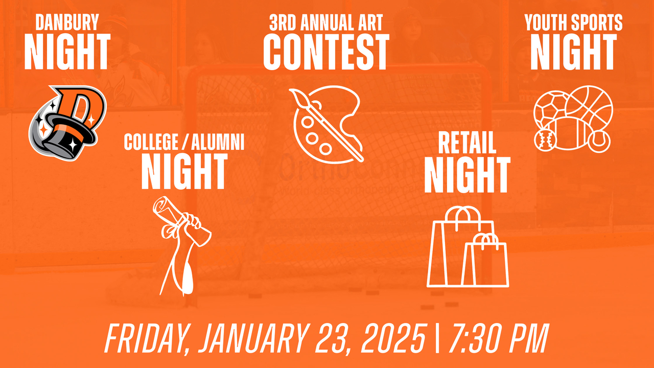- Great to Live in Danbury Night: In partnership with the City of Danbury, this special night honors the people and organizations that make Danbury an exceptional place to live, work, and thrive. The evening highlights educators, business leaders, first responders, and other outstanding community contributors. Residents can nominate local “Danbury Champions” to be recognized on-ice, with honorees receiving complimentary tickets for themselves and their families. Additional tickets for friends and family are available for $11.50. Danbury residents and workers can enjoy a special $10 ticket rate using code DANBURY, with a portion of proceeds benefiting the Connecticut Education Foundation, supporting scholarships, student support, recreation, and unique learning experiences. Nominate heroes here.