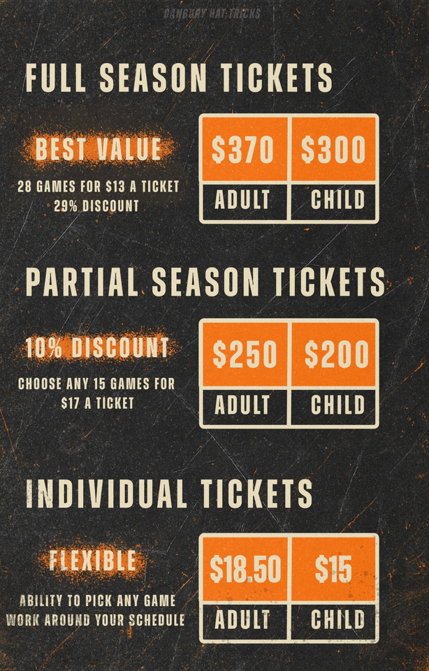 Single-Game Tickets and Season Packages are on sale now! If you are a Season Ticket renewal or interested in purchasing a Season Package click here or contact herm@danburyhattricks.com.